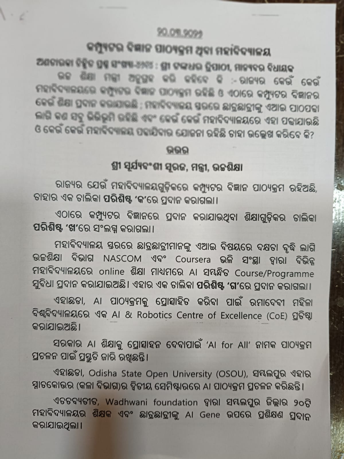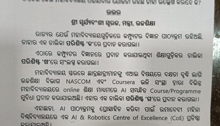 ଭୁବନେଶ୍ୱର,୨୦/୦୩:ଉଚ୍ଚ ଶିକ୍ଷାନୁଷ୍ଠାନ ଆରମ୍ଭ ହେବ ‘AI for ALL’ ପାଠ୍ୟକ୍ରମ।AI ଶିକ୍ଷାକୁ ମିଳିବ ଉଡାଣ। କଲେଜରେ ଆରମ୍ଭ ହେବ AI ଶିକ୍ଷା।’AI for ALL’ ପାଠ୍ୟକ୍ରମ ଜରିଆରେ AI ଶିକ୍ଷାକୁ ଦିଆଯିବ ପ୍ରୋତ୍ସାହନ। ରମାଦେବୀ ବିଶ୍ୱବିଦ୍ୟାଳୟରେ ଖୋଲାଯାଇଛି AI & ROBOTICS CENTER of EXCELLENCE। Odisha State Open University, ସମ୍ବଲପୁରରେ କଳା ସ୍ନାତକୋତର ଦ୍ଵିତୀୟ ସେମିଷ୍ଟାରରେ AI ପାଠ୍ୟକ୍ରମ ପଢା ଯାଉଛି। ଗୃହରେ ଲିଖିତ ଉତ୍ତର ରଖିଲେ ଉଚ୍ଚଶିକ୍ଷା ମନ୍ତ୍ରୀ ସୂର୍ଯ୍ୟବଂଶୀ ସୂରଜ ।