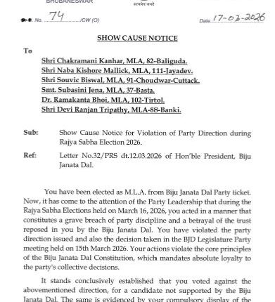 ଦଳର ଅଭିଯୋଗ ଅନୁଯାୟୀ, ଉକ୍ତ ବିଧାୟକମାନେ ରାଜ୍ୟସଭା ନିର୍ବାଚନ ସମୟରେ ଦଳୀୟ ନିର୍ଦ୍ଦେଶକୁ ଉଲଂଘନ କରି କ୍ରସ୍ ଭୋଟିଂ କରିଛନ୍ତି। ଏହା ଦଳୀୟ ଶୃଙ୍ଖଳାଭଙ୍ଗ ବୋଲି ମନାଯାଇଛି।ସ୍ପଷ୍ଟିକରଣ ପାଇଁ ଦିଆଯାଇଥିବା ସମୟସୀମା ମଧ୍ୟରେ ଉତ୍ତର ନମିଳିଲେ ଦଳ ପକ୍ଷରୁ ଆଇନଗତ ଓ ଦଳୀୟ କାର୍ଯ୍ୟାନୁଷ୍ଠାନ ଆହୁରି କଡ଼ା ହେବାର ସଙ୍କେତ ମିଳିଛି।