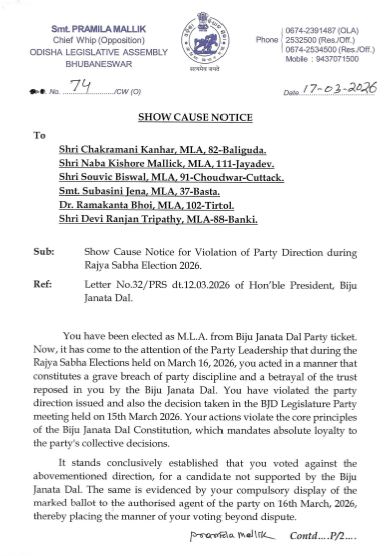 ବାଲିଗୁଡ଼ା ବିଧାୟକ ଚକ୍ରମଣି କହଁର, ଜୟଦେବ (ଭୁବନେଶ୍ବର) ବିଧାୟକ ନବ କିଶେର ମଲ୍ଲିକ, କଟକ-ଚୌଦ୍ବାର ବିଧାୟକ ସୌଭିକ ବିଶ୍ବାଳ, ବସ୍ତା ବିଧାୟକ ସୁବାସିନୀ ଜେନା, ତିର୍ତ୍ତୋଲ ବିଧାୟକ ରମାକାନ୍ତ ଭୋଇ, ବାଙ୍କୀ ବିଧାୟକ ଦେବୀ ରଂଜନ ତ୍ରିପାଠୀଙ୍କୁ ଏହି ନୋଟିସ୍ ଜାରି ହୋଇଛି।