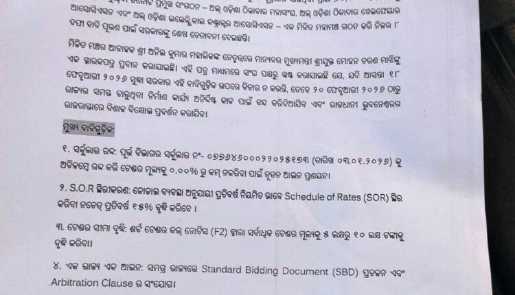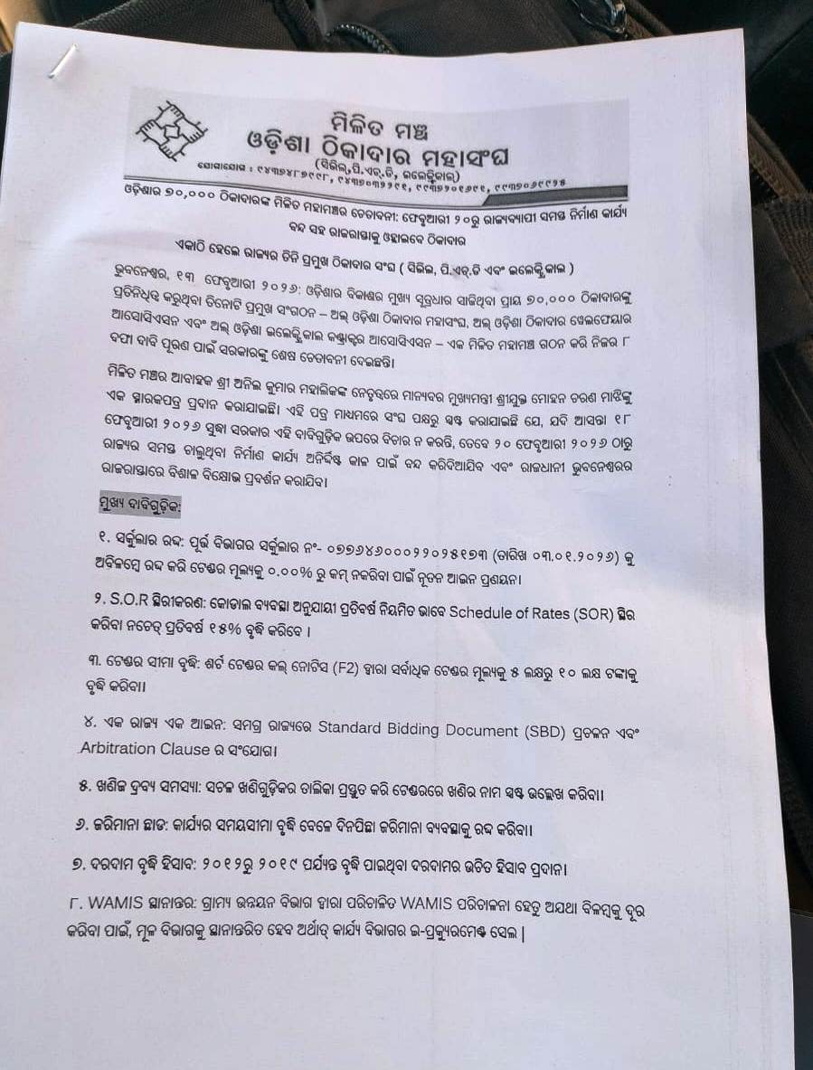 ଭୁବନେଶ୍ଵର,୧୩/୦୨:୨୦ରୁ ଠିକାଦାରଙ୍କ ରାଜ୍ୟବ୍ୟାପୀ ଆନ୍ଦୋଳନ।୧୮ ସୁଦ୍ଧା ୮ ଦଫା ଦାବି ପୂରଣ ନ ହେଲେ ୨୦ରୁ ଆନ୍ଦୋଳନ ଚେତାବନୀ।ରାଜ୍ୟବ୍ୟାପୀ ଠପ୍ ହେବ ସମସ୍ତ ସରକାରୀ ନିର୍ମାଣ କାର୍ଯ୍ୟ।ଏକାଠି ହେବେ ୭୦ ହଜାର ଠିକାଦାର ଓ ୩ ପ୍ରମୁଖ ଠିକାଦାର ସଂଘ।ପ୍ରେସମିଟ୍ରେ ମିଳିତ ମଞ୍ଚ ଓଡ଼ିଶା ଠିକାଦାର ମହାସଂଘର ଚେତାବନୀ।ରାଜଧାନୀ ରାଜରାସ୍ତାରେ ବିଶାଳ ସମାବେଶ କରିବ ମହାସଂଘ।ଟେଣ୍ଡର ସୀମା ବୃଦ୍ଧି, ଜରିମାନା ଛାଡ଼ ଆଦି ୮ ଦଫା ଦାବି କରିଛି ମହାସଂଘ।