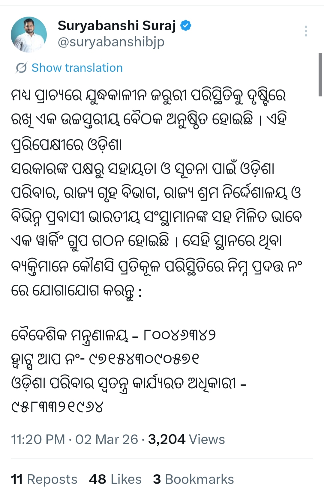 ଭୁବନେଶ୍ଵର,୦୩/୦୩:ମଧ୍ୟ ପ୍ରାଚ୍ୟରେ ଯୁଦ୍ଧକାଳୀନ ଜରୁରୀ ପରିସ୍ଥିତିକୁ ଦୃଷ୍ଟିରେ ରଖି ଏକ ଉଚ୍ଚସ୍ତରୀୟ ବୈଠକ ଅନୁଷ୍ଠିତ ହୋଇଛି ।ଏହି ପ୍ରରିପେକ୍ଷୀରେ ଓଡ଼ିଶା ସରକାରଙ୍କ ପକ୍ଷରୁ ସହାୟତା ଓ ସୂଚନା ପାଇଁ ଓଡ଼ିଶା ପରିବାର, ରାଜ୍ୟ ଗୃହ ବିଭାଗ, ରାଜ୍ୟ ଶ୍ରମ ନିର୍ଦ୍ଦେଶାଳୟ ଓ ବିଭିନ୍ନ ପ୍ରବାସୀ ଭାରତୀୟ ସଂସ୍ଥାମାନଙ୍କ ସହ ମିଳିତ ଭାବେ ଏକ ୱାର୍କିଂ ଗ୍ରୁପ ଗଠନ ହୋଇଛି।ମଧ୍ୟପ୍ରାଚ୍ୟରେ ଫସି ଥିବା ଓଡ଼ିଆଙ୍କ ପାଇଁ ହେଲ୍ପଲାଇନ ନମ୍ବର ଜାରି।ଯୁଦ୍ଧକାଳୀନ ଜରୁରୀ ପରସ୍ଥିତିକୁ ଦୃଷ୍ଟିରେ ରଖି ଓଡ଼ିଶା ସରକାରଙ୍କ ନିଷ୍ପତ୍ତି।ଏକ୍ସରେ ପୋଷ୍ଟ କରି ସୂଚନା ଦେଲେ କ୍ରୀଡା ଓ ଯୁବବ୍ୟାପାର ମନ୍ତ୍ରୀ।ସେହି ସ୍ଥାନରେ ଥିବା ବ୍ୟକ୍ତିମାନେ କୌଣସି ପ୍ରତିକୂଳ ପରିସ୍ଥିତିରେ ନିମ୍ନ ପ୍ରଦତ୍ତ ନଂ ରେ ଯୋଗାଯୋଗ କରନ୍ତୁ :ବୈଦେଶିକ ମନ୍ତ୍ରଣାଳୟ- ୮୦୦-୪୬୩୪୨