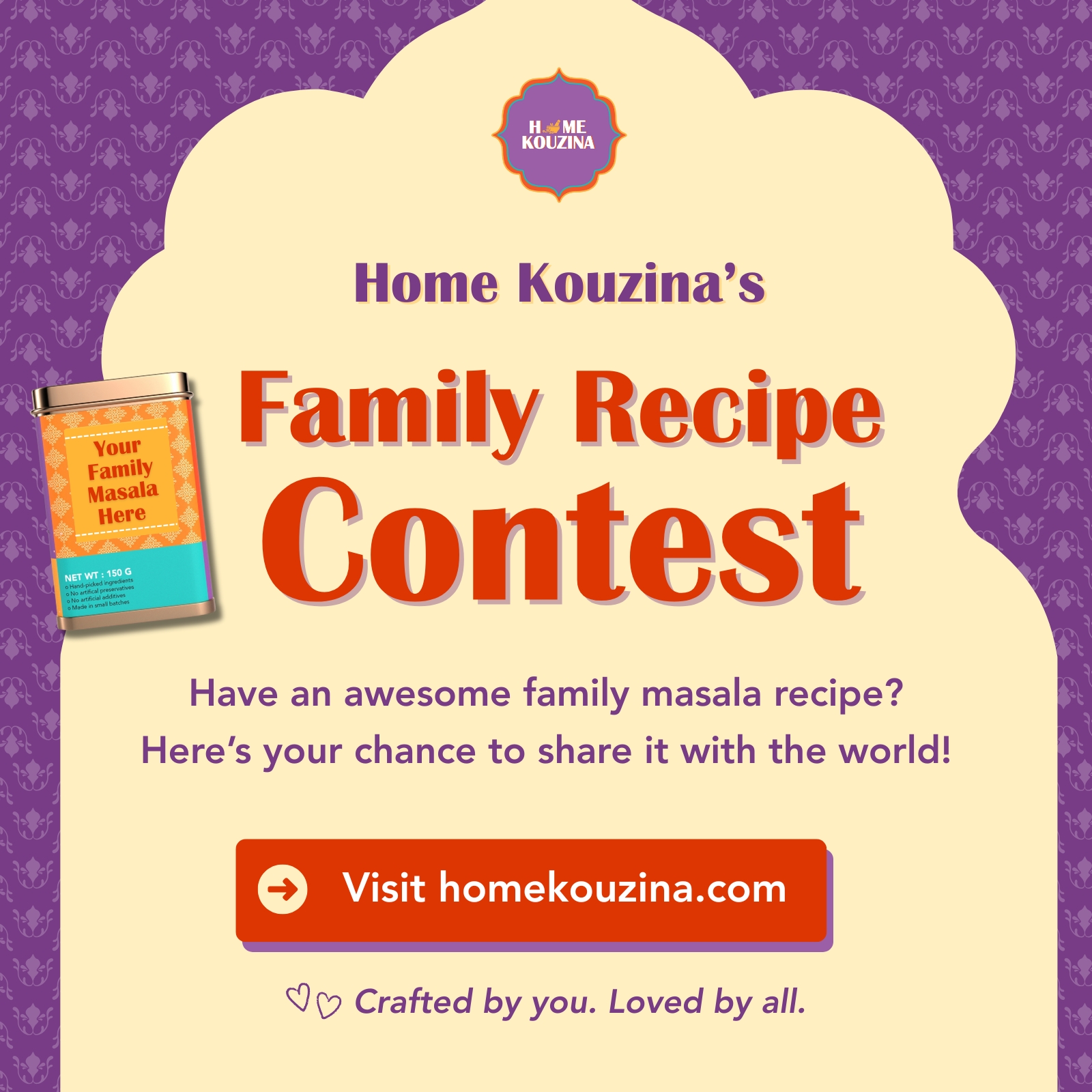 ବର୍ତମାନଠାରୁ ଆରମ୍ଭ ହୋଇ ଜୁନ୍ ୧୪, ୨୦୨୫ ପର୍ଯ୍ୟନ୍ତ ଏହି ପ୍ରତିଯୋଗିତା ଚାଲିବ ଏବଂ ହୋମ୍ କୌଜିନାର ୱେବସାଇଟ ଓ ଇନ୍ଷ୍ଟାଗ୍ରାମ ହ୍ୟାଣ୍ଡେଲ ମାଧ୍ୟମରେ ଆବେଦନ କରାଯାଇପାରିବ । ପ୍ରଥମ ୫୦ଟି ଆବେଦନକୁ ଏକ ସ୍ୱତନ୍ତ୍ର ହୋମ କୌଜିନା ଭାଉଚର ମିଳିବ ଯାହାକୁ ହୋମ କୌଜିନାରେ ଉପଲବ୍ଧ ଅନେକ ସ୍ୱାଦିଷ୍ଟ ମସଲା ଓ ଆଚାର ପାଇଁ ରିଡିମ କରାଯାଇପାରିବ । ବିଜେତା ମସଲା ରେସିପିକୁ ଦେଶବ୍ୟାପୀ ଖାଦ୍ୟପ୍ରେମୀଙ୍କ ପାଇଁ ଏହାର ସ୍ୱାଦ ପାଇବାକୁ ସକ୍ଷମ ହେବା ଲାଗି ବ୍ରାଣ୍ଡର ୱେବସାଇଟରେ ତାଲିକାଭୁକ୍ତ କରାଯିବ । ଏବଂ କେବଳ ଏତିକି ନୁହେଁ ବିଜେତାଙ୍କୁ ଦୁଇଜଣଙ୍କ ପାଇଁ ଦେଶର ମସାଲା କ୍ୟାପିଟାଲ କେରଳରେ ଛୁଟି କଟାଇବାର ଏକ ସୁଯୋଗ ମଧ୍ୟ ମିଳିବ । ତେଣୁ ଆପଣଙ୍କର ମସଲା ରେସିପିକୁ ଏବେ ହିଁ ସେୟାର କରନ୍ତୁ; ଏଥିପାଇଁ ଭିଜିଟ କରନ୍ତୁ:https://homekouzina.com/pages/home-kouzina-family-recipe-contest