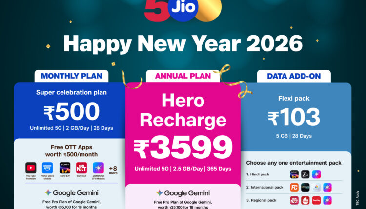୨୦୨୬ ର ହାପି ନ୍ୟୁ ଇୟର ଅଫରର ଅଂଶ ଭାବରେ, ଜିଓ ୩୫୯୯ ଟଙ୍କା ମୂଲ୍ୟର ହିରୋ ବାର୍ଷିକ ରିଚାର୍ଜ ପ୍ଲାନ ଶୁଭାରମ୍ଭ କରିଛି। ଏହି ପ୍ଲାନ ୩୬୫ ଦିନର ବୈଧତା ସହିତ ଅସୀମିତ ୫ଜି, ପ୍ରତିଦିନ ୨.୫ ଜିବି ହାଇ-ସ୍ପିଡ୍ ଡାଟା, ଅସୀମିତ ଭଏସ୍ କଲ୍ ଏବଂ ପ୍ରତିଦିନ ୧୦୦ ଏସଏମଏସ ସୁବିଧା ପ୍ରଦାନ କରୁଛି। ଏହି ପ୍ଲାନରେ ୧୮ ମାସର ଗୁଗୁଲ ଜେମିନି ପ୍ରୋ (ଏକ୍ଟକ୍ଟଶକ୍ଷର ଏରଜ୍ଞସଦ୍ଭସ ଚକ୍ସକ୍ଟ) ପ୍ଲାନ୍ ମଧ୍ୟ ଅନ୍ତର୍ଭୁକ୍ତ ରହିଛି, ଯାହାର ଆନୁମାନିକ ବଜାର ମୂଲ୍ୟ ୩୫,୧୦୦ ଟଙ୍କା ଆକଳନ କରାଯାଇଛି।