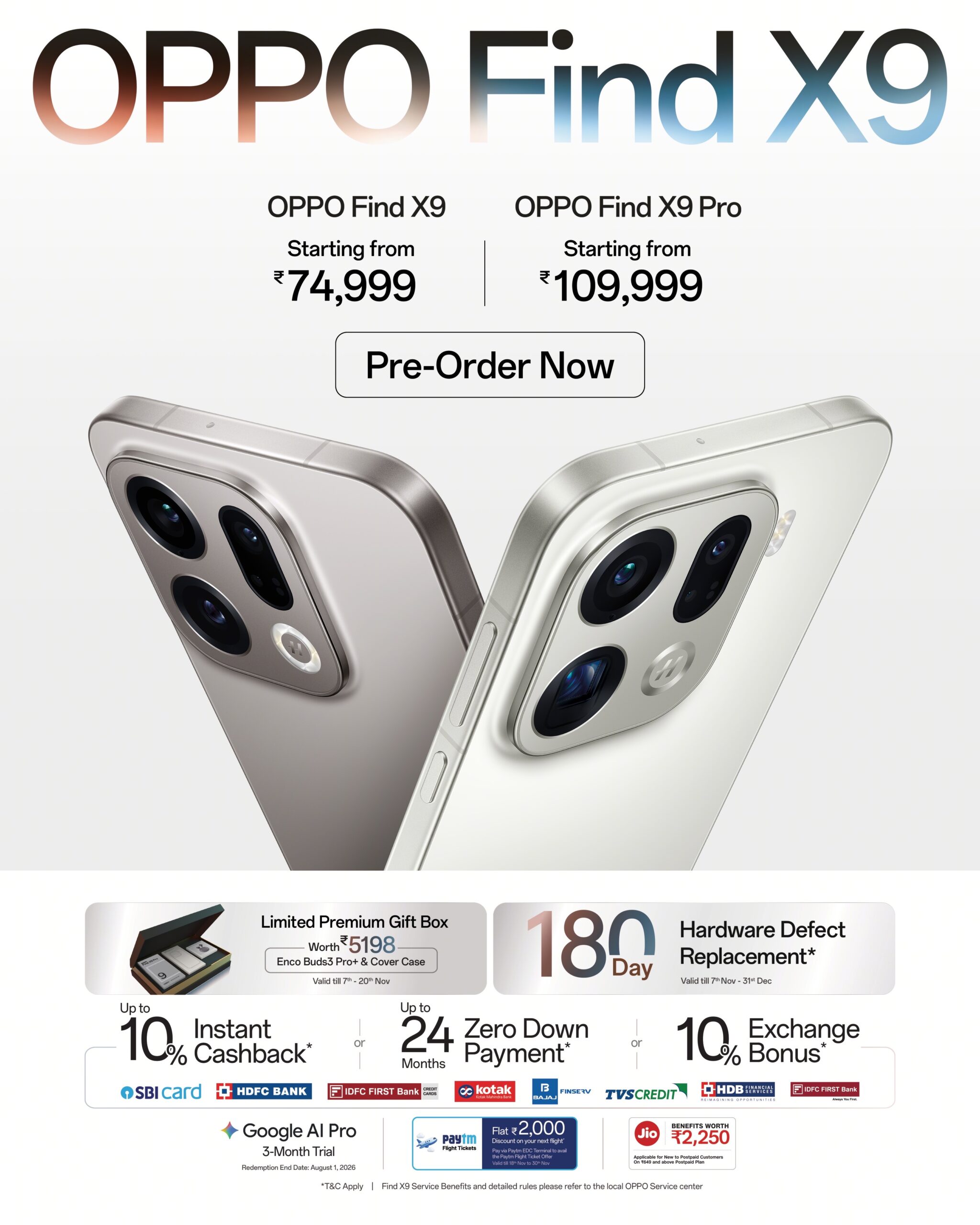 ସେହିପରି ଫାଇଣ୍ଡ ଏକ୍ସ୯ ଓପୋ ଷ୍ଟୋର, ଫ୍ଲିପକାର୍ଟ ଓ ମେନ୍ଲାଇନ ରିଟେଲ ଆଉଟଲେଟରେ ଉପଲବ୍ଧ ହେବ । ଏହାର ହାସେଲବ୍ଲାଡ ଟେଲିକନ୍ର୍ଭଟର କିଟ ୨୯,୯୯୯ ଟଙ୍କାର ଏକ ଅତିରିକ୍ତ ମୂଲ୍ୟରେ ଓପୋ ଇଷ୍ଟୋରରେ ଉପଲବ୍ଧ ହେବ । ଫାଇଣ୍ଡ ଏକ୍ସ୯ ସିରିଜ ସହିତ ଓପୋ ପକ୍ଷରୁ ଏହାର ନୂଆ ଟିଡବ୍ଲ୍ୟୁଏସ ଏନକୋ ବଡ୍ସ ୩ ପ୍ରୋ+ର ମଧ୍ୟ ଶୁଭାରମ୍ଭ କରାଯାଇଛି ଯାହାର ମୂଲ୍ୟ ୨୦୯୯ ଟଙ୍କା ରହିଛି, ଏବଂ ଏହା ନଭେମ୍ବର ୨୧ ତାରିଖରୁ ୩୦ ତାରିଖ ୨୦୨୫ ପର୍ଯ୍ୟନ୍ତ ୧୮୯୯ ଟଙ୍କାର ଏକ ଲଂଚ୍ ଅଫର୍ ମୂଲ୍ୟରେ , ଓପୋ ଇଷ୍ଟୋର, ଫ୍ଲିପକାର୍ଟ, ଆମାଜନ ଓ ମେନ୍ଲାଇନ ରିଟେଲ ଷ୍ଟୋରଗୁଡିକରେ ଉପଲବ୍ଧ ହେବ ।