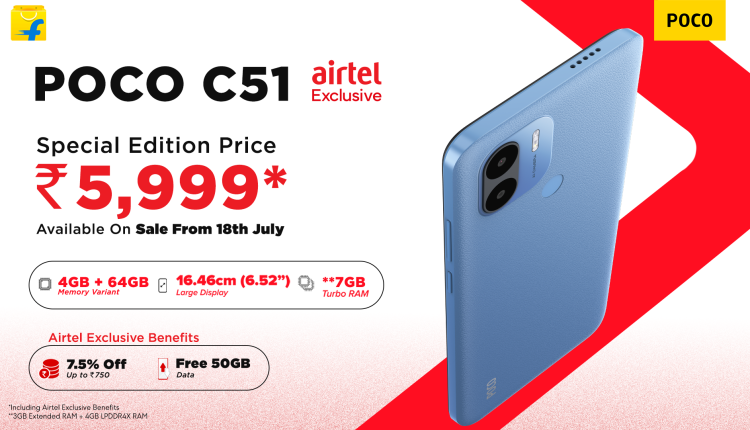 ଭୁବନେଶ୍ୱର: ଭାରତର ଅନ୍ୟତମ ଅଗ୍ରଣୀ ଉପଭୋକ୍ତା ଟେକ୍ନୋଲୋଜି ବ୍ରାଣ୍ଡ ପୋକୋ ଇଣ୍ଡିଆ, ଦେଶର ସବୁଠାରୁ ଶସ୍ତା ୪ଜି ସ୍ମାର୍ଟଫୋନ୍ ଶୁଭାରମ୍ଭ କରିବା ପାଇଁ ଏୟାରଟେଲ୍ ସହ ନିଜର ସହଭାଗିତା ସମ୍ପର୍କରେ ଘୋଷଣା କରିଛି । ପୋକୋ ସି୫୧କୁ ଏୟାରଟେଲ୍ ପ୍ରିପେଡ୍ କନେକ୍ସନ ସହ ଫ୍ଲିପ୍କାର୍ଟରେ ୫୯୯୯ ଟଙ୍କାର ପ୍ରାରମ୍ଭିକ ମୂଲ୍ୟରେ ଉପଲବ୍ଧ କରାଯିବ । ଉପଭୋକ୍ତାମାନେ ଫ୍ଲିପ୍କାର୍ଟରେ ଆସନ୍ତା ଜୁଲାଇ ୧୮ ତାରିଖରୁ ଏହି ସ୍ମାର୍ଟଫୋନ୍କୁ କ୍ରୟ କରିପାରିବେ । ସ୍ୱତନ୍ତ୍ର ମୂଲ୍ୟ ସହିତ ଏହି ଡିଭାଇସ୍ କିଣିବାକୁ ଚାହୁଁଥିବା ସମସ୍ତ ଏୟାରଟେଲ୍ ପ୍ରିପେଡ୍ ଗ୍ରାହକମାନେ ଏୟାରଟେଲ୍ ତରଫରୁ ୫୦ ଜିବିର ୱାନ୍-ଟାଇମ୍ ମୋବାଇଲ ଡାଟା ପାଇବେ । ଏହି ଅଫର୍ ପାଇବାକୁ ଚାହୁଁଥିବା ଅଣ-ଏୟାରଟେଲ୍ ଗ୍ରାହକମାନେ ତତ୍କାଳ ଆକ୍ଟିଭେଶନ ସହିତ ଏୟାରଟେଲ୍ ଦ୍ୱାରା ଡୋର୍ଷ୍ଟେପ୍ ସିମ୍ ଡେଲିଭରି ପାଇଁ ଚୟନ କରିପାରିବେ ।