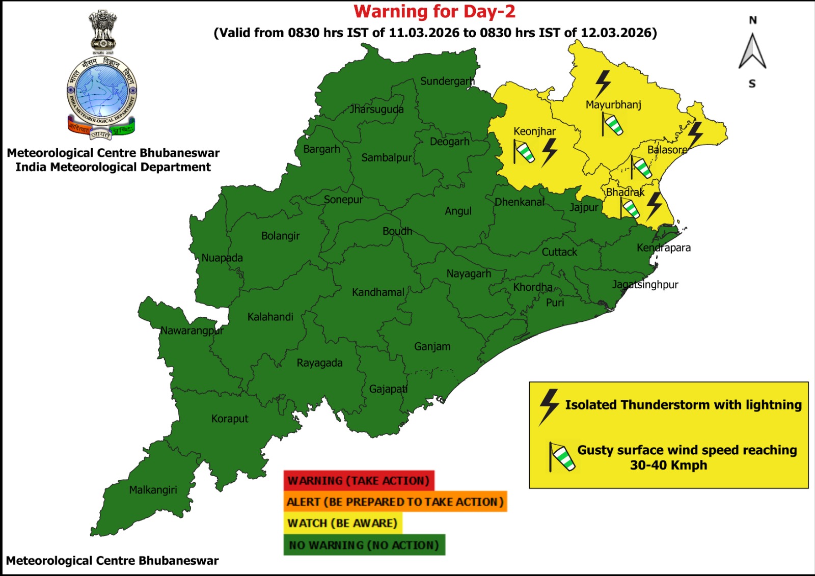 ଭୁବନେଶ୍ଵର,୧୦/୦୩:ଘୁର୍ଣ୍ଣିବଳୟ ପ୍ରଭାବରେ ଓଡ଼ିଶାରେ ଦୁଇ ଦିନ ବର୍ଷା ସମ୍ଭାବନା । ଆଜି ଓ ଆସନ୍ତାକାଲି ପାଇଁ ବିଜୁଳି ଘଡଘଡି ସହ ହାଲୁକରୁ ମଧ୍ୟମ ଧରଣର ବର୍ଷା ସମ୍ଭାବନା ରହିଛି। ଦକ୍ଷିଣ ଝାରଖଣ୍ଡ ଓ ଉତ୍ତର ଛତିଶଗଡ଼ ଉପରେ ଏକ ଘୁର୍ଣ୍ଣିବଳୟ ସକ୍ରିୟ ରହିଛି। ଘୁର୍ଣ୍ଣିବଳୟ ସହ ଜଡିତ ଏକ ଟ୍ରପ ଲାଇନ ଓଡିଶା ଦେଇ ଅତିକ୍ରମ କରୁଛି। ପ୍ରଭାବରେ ରାଜ୍ୟରେ ୧୦ ଓ ୧୧ ବର୍ଷା ସମ୍ଭାବନା ଥିବା ବେଳେ ଆଜି ଆଭ୍ୟନ୍ତରୀଣ ଓଡ଼ିଶାର ୪ ଜିଲ୍ଲା ଭଦ୍ରକ,ବାଲେଶ୍ୱର ,କେନ୍ଦୁଝର ,ମୟୁରଭଞ୍ଜ ରେ ହଲୁକାରୁ ମଧ୍ୟମ ଧରଣର ବର୍ଷା ସମ୍ଭାବନାକୁ ନେଇ ୟେଲୋ ବର୍ଣ୍ଣିଙ୍ଗ ଜାରି କରିଛି ପାଣିପାଗ ବିଭାଗ । ବର୍ଷା ସମୟରେ ୩୦ ରୁ ୪୦ କିମି ପବନ ବହିବାର ସମ୍ଭାବନା ରହିଛି। ଆସନ୍ତାକାକି ସମାନ ଜିଲ୍ଲାକୁ ଚେତାବନୀ ରହିଥିବା ବେଳେ ସାରା ରାଜ୍ୟରେ ୨ ଦିନ ଯାଏ ମେଘୁଆ ପାଗ ମଧ୍ୟ ରହିବ ।