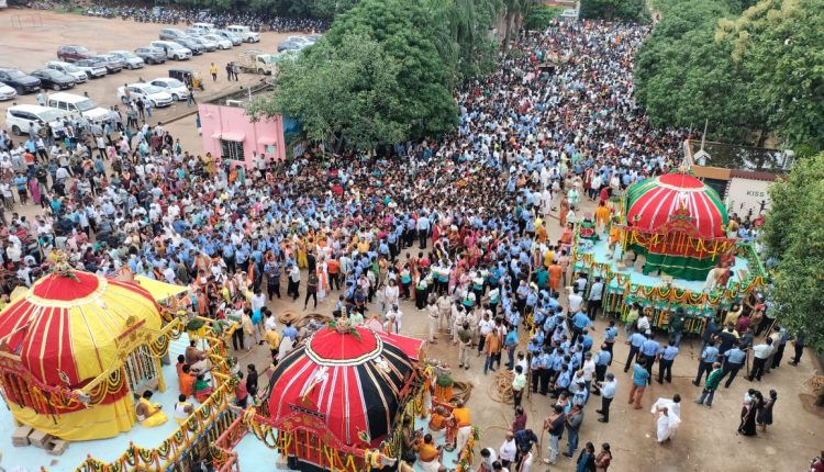 ଭୁବନେଶ୍ୱର, ୨୮ / ୬: ପ୍ରତିବର୍ଷ ପରି କିସ୍ ଶ୍ରୀବାଣୀ କ୍ଷେତ୍ରରେ ବିଶ୍ୱ ପ୍ରସିଦ୍ଧ ଘୋଷଯାତ୍ରା ମହାସମାରୋହରେ ସଂପନ୍ନ ହୋଇଯାଇଛି। ଆଜି ପୂର୍ବାହ୍ନରେ ମଙ୍ଗଳ ଆରତି, ମଇଲମ, ତଡ଼ପଲାଗି, ରୋଷ ହୋମ, ଅବକାଶ, ସୂର୍ଯ୍ୟପୂଜା ଓ ରଥ ପ୍ରତିଷ୍ଠା ଆଦି ନୀତିକାନ୍ତି ନିର୍ଦ୍ଧାରିତ ନୀତି ନିର୍ଘଣ୍ଟ ଅନୁସାରେ ସଂପନ୍ନ ହେବା ପରେ କିଟ୍ ମନ୍ଦିର ଟ୍ରଷ୍ଟ ପ୍ରତିଷ୍ଠାତା ଅଚ୍ୟୁତ ସାମନ୍ତଙ୍କ ଦ୍ୱାରା ଅପରାହ୍ନ ୩ଟାରେ ଛେରା ପହଁରା ନୀତି ସଂପନ୍ନ ହୋଇଥିଲା। ଅପରାହ୍ନ ୪ଟା ସମୟରେ ଭକ୍ତମାନେ ପ୍ରଭୁ ବଳଭଦ୍ର, ଦେବୀ ସୁଭଦ୍ରା ଓ ମହାପ୍ରଭୁ ଜଗନ୍ନାଥଙ୍କ ରଥକୁ ନବନିର୍ମିତ ଗୁଣ୍ଡିଚା ମନ୍ଦିର ପର୍ଯ୍ୟନ୍ତ ଟାଣିଥିଲେ। ଘଣ୍ଟଘଣ୍ଟା, ମୃଦଙ୍ଗ, ଖୋଳ କରତାଳ ନିନାଦ ସହ ଜୟ ଜଗନ୍ନାଥ ଧ୍ୱନୀରେ ରଥଦାଣ୍ଡ ପ୍ରକମ୍ପିତ ହୋଇଥିଲା।