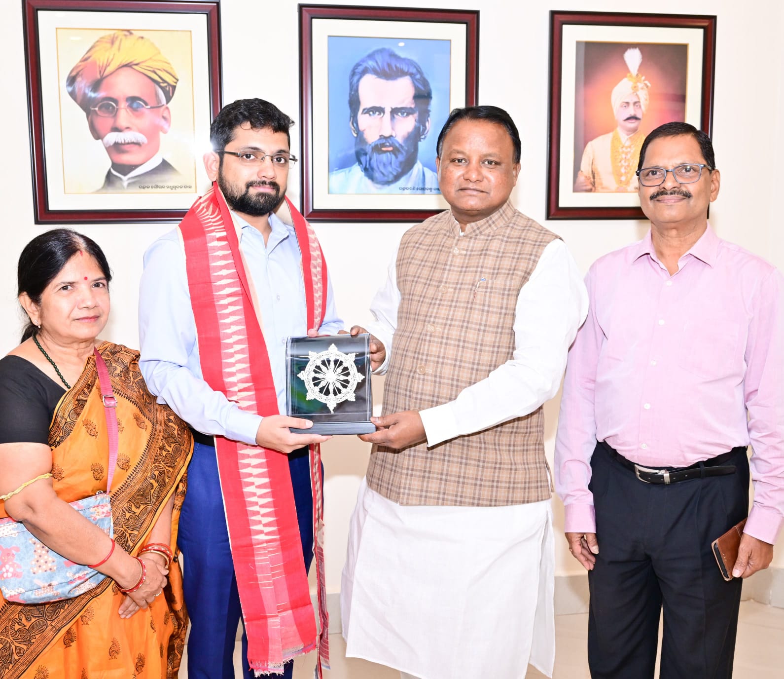 ଭୁବନେଶ୍ୱର,07/03:ସର୍ବ ଭାରତୀୟ ସିଭିଲ ସର୍ଭିସ ପରୀକ୍ଷା (UPSC) ରେ ଅଲ୍ ଇଣ୍ଡିଆ ର୍ୟାଙ୍କ ୧୦୦ ହାସଲ କରିଥିବା କେନ୍ଦୁଝର ଜିଲ୍ଲା ହାଟଡିହି ବ୍ଲକର ମେଧାବୀ ଛାତ୍ର ଶ୍ରୀ ସାତ୍ତ୍ୱିକ ସତ୍ୟକାମ ଦେବତା ନିଜ ପିତାମାତାଙ୍କ ସହ ଆଜି ଲୋକସେବା ଭବନଠାରେ ମୁଖ୍ୟମନ୍ତ୍ରୀ ମୋହନ ଚରଣ ମାଝିଙ୍କୁ ସାକ୍ଷାତ କରିଛନ୍ତି।