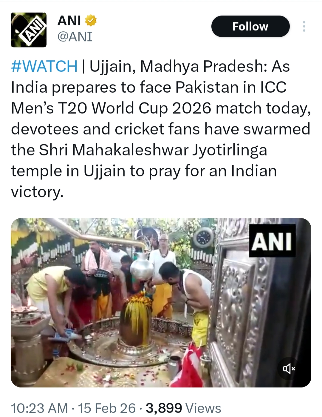 ଟି୨୦ ବିଶ୍ବକପ ୨୦୨୬ରେ ଆଜି ଭାରତ-ପାକିସ୍ତାନ ଲଢେଇ । ଭାରତ-ପାକିସ୍ତାନ ମଧ୍ୟରେ ମ୍ୟାଚ୍ ହେଲେ ସବୁଠାରୁ ଅଧିକ ଫ୍ୟାନ୍ସ ଉତ୍ସାହିତ ରହିଥାନ୍ତି । ଆଉ ଏଥିପାଇଁ ଉଜ୍ଜୈନ ମହାକାଳେଶ୍ବର ମନ୍ଦିରରେ ଟିମ ଇଣ୍ଡିଆର ବିଜୟ ପାଇଁ ଖାସ୍ ପୂଜା କରାଯାଇଛି ।