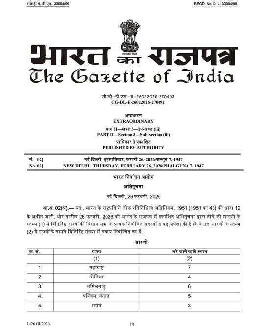 ଭୁବନେଶ୍ଵର,୨୬/୦୨:ପ୍ରକାଶ ପାଇଲା ରାଜ୍ୟସଭା ନିର୍ବାଚନ(Rajya Sabha Election) ପାଇଁ ବିଧିବଦ୍ଧ ବିଜ୍ଞପ୍ତି। ମାର୍ଚ୍ଚ ୧୬ ତାରିଖରେ ହେବ ରାଜ୍ୟସଭା ନିର୍ବାଚନ । ୧୦ ରାଜ୍ୟର ୩୭ ରାଜ୍ୟସଭା ଆସନ ପାଇଁ ନିର୍ବାଚନ ହେବାକୁ ଥିବାବେଳେ ଓଡ଼ିଶାର ୪ ଆସନ ପାଇଁ ହେବ ନିର୍ବାଚନ ।  ମାର୍ଚ୍ଚ ୫ ତାରିଖରେ ନାମାଙ୍କନ ଦାଖଲର ଶେଷ ତାରିଖ, ୬ ତାରିଖରେ ଯାଞ୍ଚ। । ମାର୍ଚ୍ଚ ୯ ରେ ପ୍ରାର୍ଥୀପତ୍ର ପ୍ରତ୍ୟାହାରର ଶେଷ ତାରିଖ ।ସେହିପରି  ମାର୍ଚ୍ଚ ୧୬ ତାରିଖ ସକାଳ ୯ରୁ ଅପରାହ୍ଣ ୪ ଯାଏଁ ଭୋଟ୍‌ ଗ୍ରହଣ,  ଅପରାହ୍ଣରେ ହେବ ଭୋଟ୍‌ ଗଣତି।