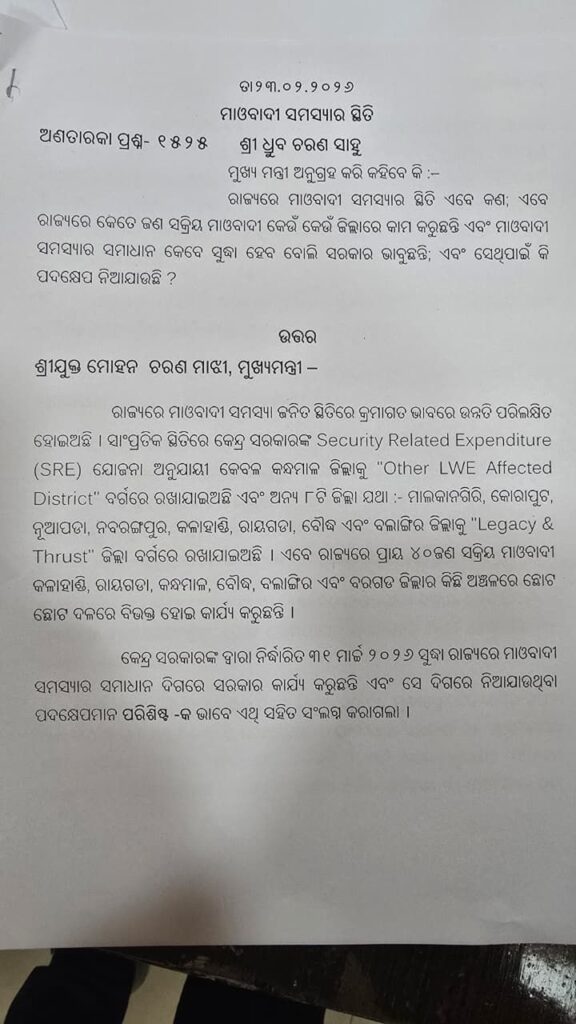 ଆଜି ବିଧାସଭାରେ ବିଜେଡି ବିଧାୟକ ଧ୍ରୁବ ସାହୁ ପ୍ରଶ୍ନରେ ପଚାରିଥିଲେ, ରାଜ୍ୟରେ ମାଓବାଦୀ ସମସ୍ୟା ସ୍ଥିତି କଣ ? ଏବେ ରାଜ୍ୟରେ କେତେ ଜଣ ମାଓବାଦୀ ସକ୍ରିୟ ରହିଛନ୍ତି ଓ କେଉଁ କେଉଁ ଅଞ୍ଚଳରେ।କେବେ ସୁଦ୍ଧା ମାଓବାଦୀ ସମସ୍ୟାର ସମାଧାନ ହେବ ବୋଲି ପ୍ରଶ୍ନ କରିଥିଲେ ।ଏହାର ଉତ୍ତର ରଖିଥିଲେ ମୁଖ୍ୟମନ୍ତ୍ରୀ ମୋହନ ଚରଣ ମାଝୀ।