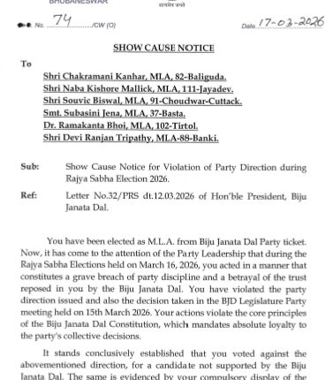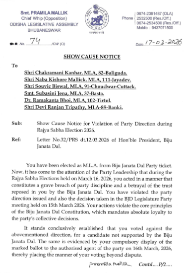 ଭୁବନେଶ୍ୱର,୨୦/୦୩:କାରଣ ଦର୍ଶାଅ ନୋଟିସ୍ର ଉତ୍ତର ରଖିଲେ ବିଜେଡିର ୬ ବିଧାୟକ।ECIଙ୍କ ନିର୍ଦ୍ଦେଶନାମା, ସୁପ୍ରିମକୋର୍ଟଙ୍କ ରାୟର ଉଲ୍ଲଙ୍ଘନ ବୋଲି ଲେଖିଲେ।ମୁଖ୍ୟ ସଚେତକ ପ୍ରମିଳା ମଲ୍ଲିକଙ୍କ ନାଁରେ ଫୌଜଦାରୀ ମାମଲା ଚେତାବନୀ।ରାଜ୍ୟସଭା ନିର୍ବାଚନରେ ଦଳୀୟ ହ୍ବିପ୍ କାମ କରେ ନାହିଁ ଦର୍ଶାଇଲେ।ମୁଖ୍ୟ ସଚେତକ ହ୍ବିପ୍ ଜାରି କରି ବେଆଇନ କାର୍ଯ୍ୟ କରିଛନ୍ତି।ଭୋଟ୍ ଦେବା ପାଇଁ କହିବା ଓ ବିରତ ପାଇଁ ପ୍ରବର୍ତ୍ତାଇବା ଦଣ୍ଡନୀୟ ଅପରାଧ।ଏଥିପାଇଁ BNS- ୧୭୧ ଅନୁଯାୟୀ ବର୍ଷେ ଜେଲ୍ ଦଣ୍ଡର ପ୍ରାବଧାନ ରହିଛି।ପ୍ରମିଳାଙ୍କ ବିରୋଧରେ ଫୌଜଦାରୀ ମାମଲା କରିବାକୁ ବିଧାୟକଙ୍କ ଚେତାବନୀ।କାରଣ ଦର୍ଶାଅ ନୋଟିସ୍ ପ୍ରତ୍ୟାହାର କରନ୍ତୁ, ନଚେତ୍ ମାମଲାକୁ ସାମ୍ନା କରନ୍ତୁ।