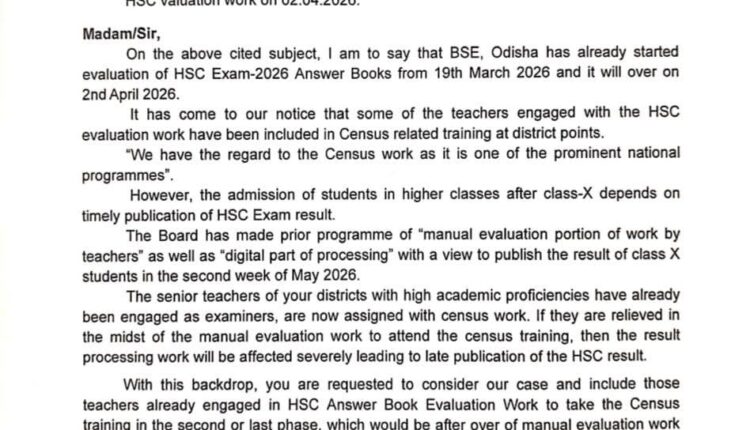 ବୋର୍ଡ ଅନୁସାରେ, ମାର୍ଚ୍ଚ ୧୯ ରୁ ଆରମ୍ଭ ହୋଇଥିବା HSC-୨୦୨୬ ମୂଲ୍ୟାୟନ କାମ ଏପ୍ରିଲ ୨ ରେ ସମାପ୍ତ ହେବ। ଏହି ପ୍ରକ୍ରିୟା ନିର୍ଦ୍ଧାରିତ ସମୟମଧ୍ୟରେ ସରିବା ଜରୁରୀ। କାରଣ ମେ ମାସ ଦ୍ୱିତୀୟ ସପ୍ତାହରେ ଫଳାଫଳ ପ୍ରକାଶ ପାଇବା ନେଇ ଯୋଜନା ରହିଛି, ଯାହା ଫଳରେ ଉଚ୍ଚ ଶିକ୍ଷାରେ ନାମଲେଖା ପ୍ରକ୍ରିୟା ସହଜ ହୋଇପାରିବ। କିନ୍ତୁ, ମୂଲ୍ୟାୟନ କାର୍ଯ୍ୟରେ ନିୟୋଜିତ ବହୁ ଶିକ୍ଷକଙ୍କୁ ଏହି ସମୟରେ ଜିଲ୍ଲାସ୍ତରରେ ଜନଗଣନା ଟ୍ରେନିଂରେ ଯୋଗଦେବାକୁ କୁହାଯାଇଥିବାରୁ ସମସ୍ୟା ସୃଷ୍ଟି ହେଉଛି। ବୋର୍ଡ ତରଫରୁ ଆଶଙ୍କା ପ୍ରକାଶ ପାଇଛି ଯେ, ମୂଲ୍ୟାୟନ କାର୍ଯ୍ୟ ମଝିରୁ ଶିକ୍ଷକଙ୍କୁ ଜନଗଣନା ଟ୍ରେନିଂରେ ସାମିଲ୍ କରାଗଲେ ଉଭୟ ଅଫଲାଇନ ମୂଲ୍ୟାୟନ ଏଵଂ ଅନଲାଇନ୍ କାର୍ଯ୍ୟ ବାଧାପ୍ରାପ୍ତ ହେବ। ଜନଗଣନା ଏକ ଗୁରୁତ୍ୱପୂର୍ଣ୍ଣ କାର୍ଯ୍ୟ। କିନ୍ତୁ ଆବଶ୍ୟକୀୟ ସମନ୍ଵୟ ମଧ୍ଯ ଜରୁରୀ। ମୂଲ୍ୟାୟନ କାର୍ଯ୍ୟ ଶେଷ ପରେ, ଅର୍ଥାତ୍ ଏପ୍ରିଲ ୨ ପରେ, ଏହି ଶିକ୍ଷକମାନଙ୍କୁ ଦ୍ୱିତୀୟ କିମ୍ବା ଶେଷ ପର୍ଯ୍ୟାୟରେ ଟ୍ରେନିଂ ଦେବାକୁ ଅନୁରୋଧ କରାଯାଇଛି।
