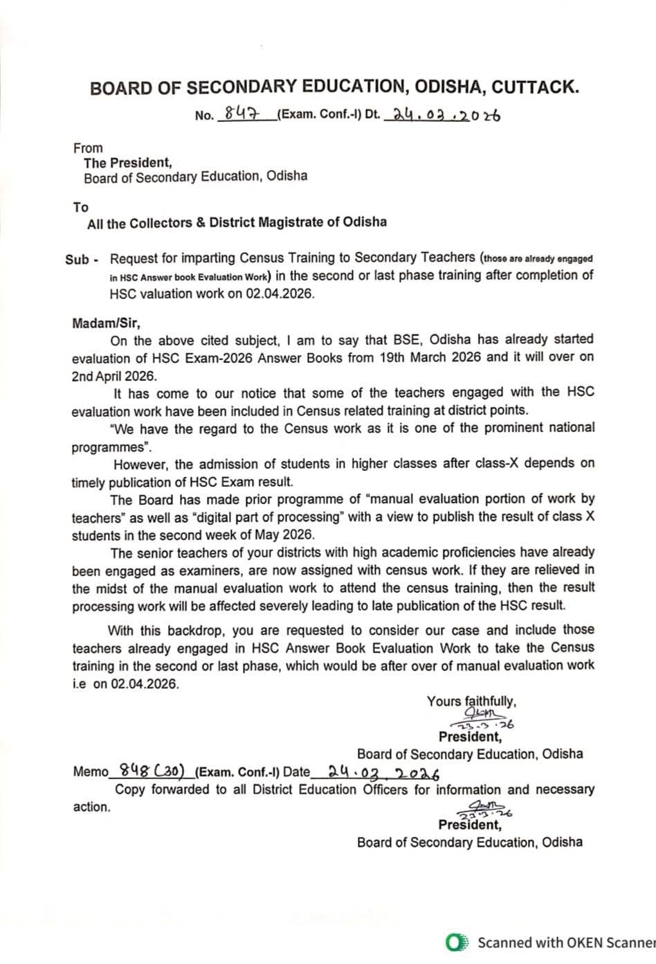 ଭୁବନେଶ୍ୱର,୨୫/୦୩:Board of Secondary Education, Odisha ପକ୍ଷରୁ ରାଜ୍ୟର ସମସ୍ତ ଜିଲ୍ଲାପାଳଙ୍କୁ ଚିଠି ଲେଖି ମାଟ୍ରିକ୍ (HSC) ପରୀକ୍ଷାର ମୂଲ୍ୟାୟନ କାର୍ଯ୍ୟରେ ଲାଗିଥିବା ଶିକ୍ଷକମାନଙ୍କ ପାଇଁ ଜନଗଣନା ଟ୍ରେନିଂ ସମୟ ପରିବର୍ତ୍ତନ କରିବାକୁ ଅନୁରୋଧ କରାଯାଇଛି।